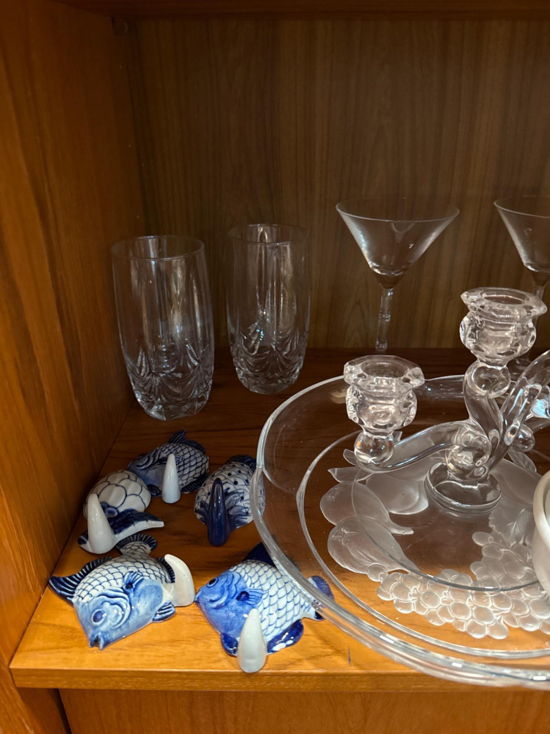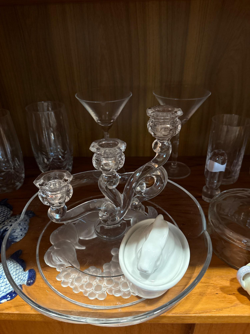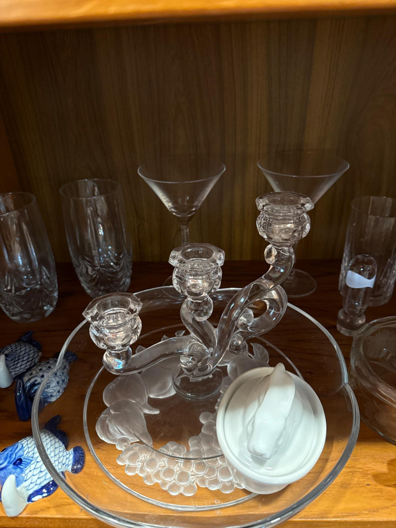 multiple crystal and glass pieces such as candlestick holders, fluted stemware,