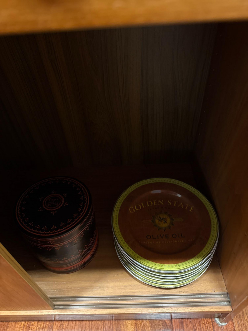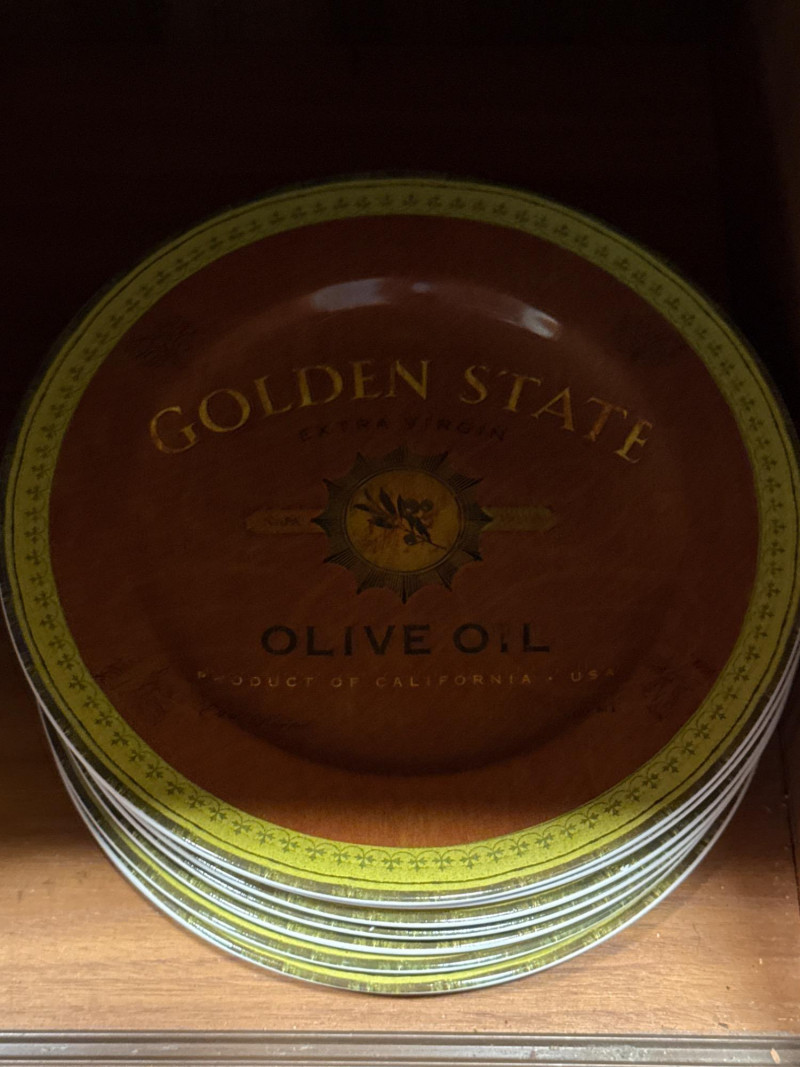 contains a stack of plates marked “Golden State Extra Virgin Olive Oil –