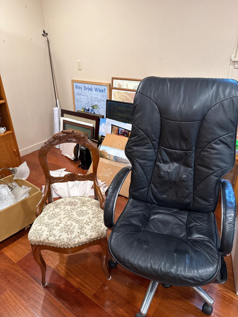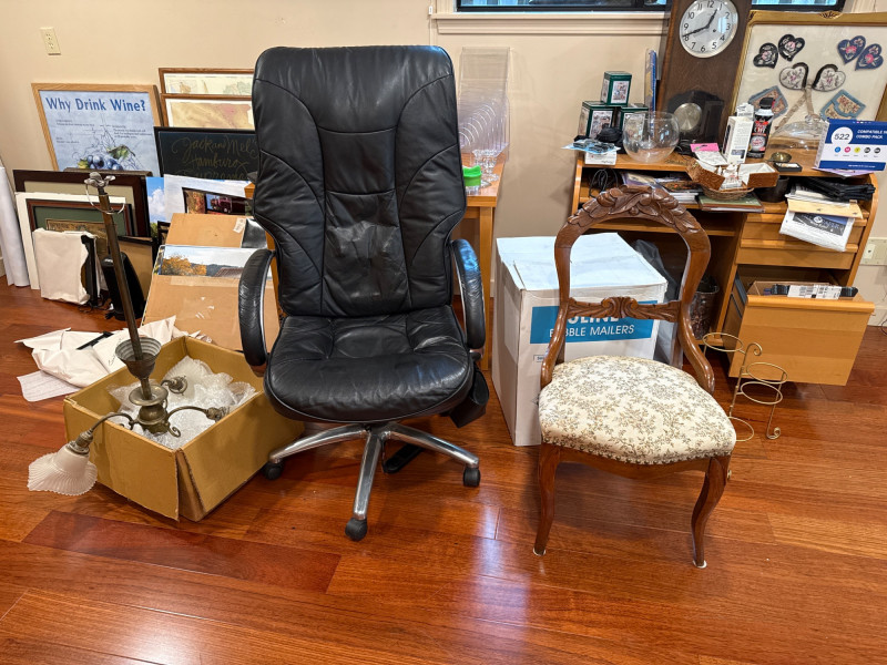 items. Featured are two chairs: a black leather swivel office chair with padded