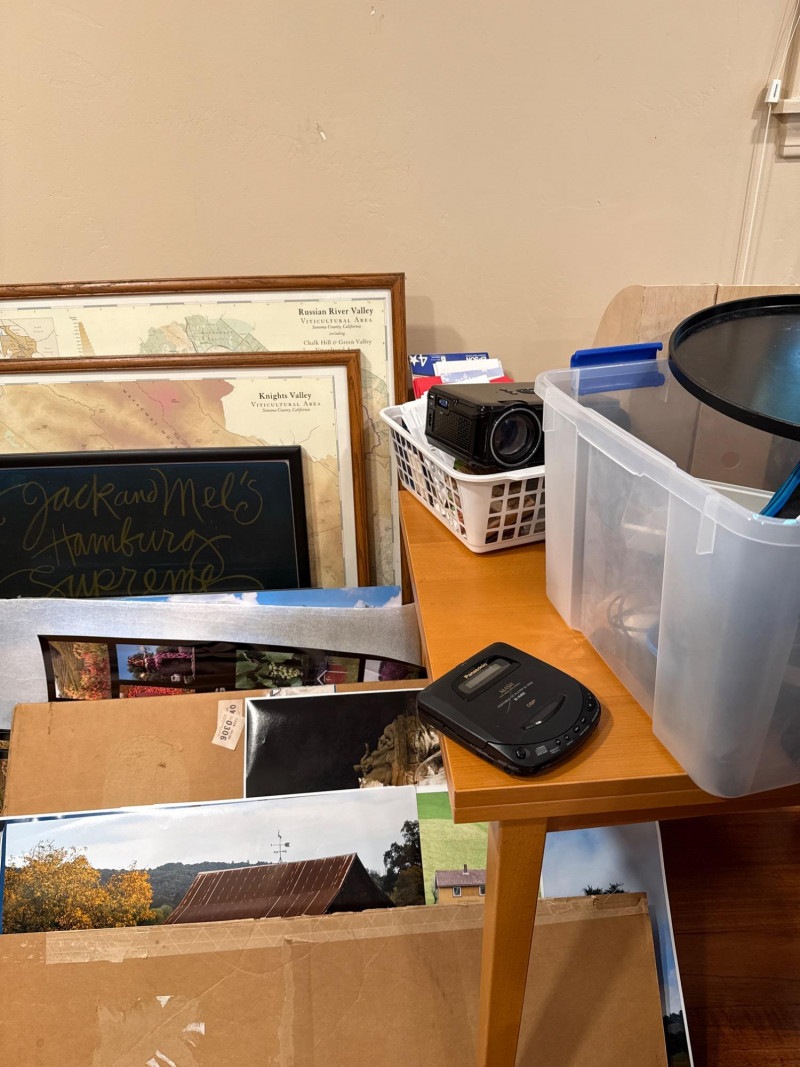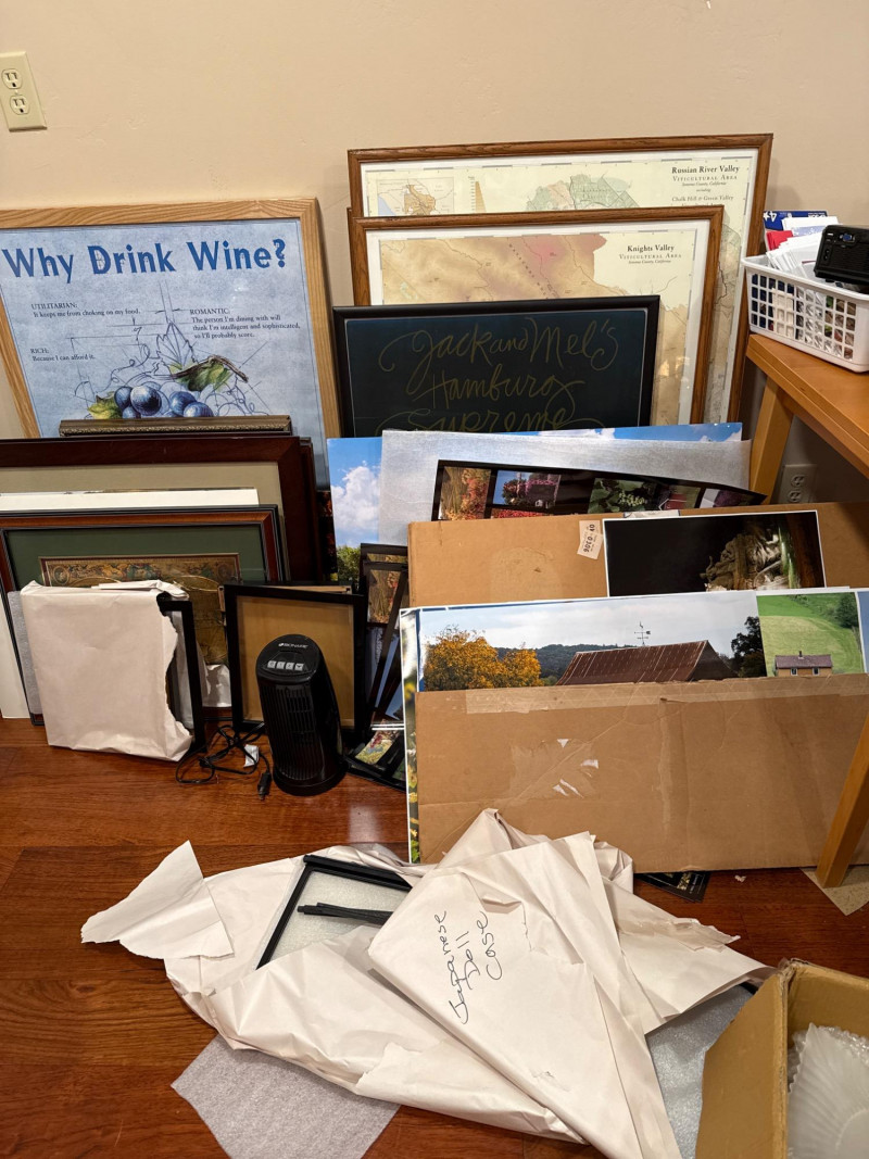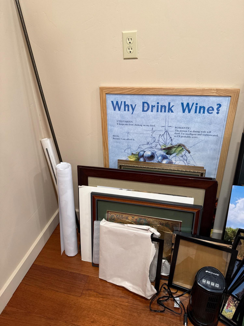 maps, including a large print titled “Why Drink Wine?” and several landscape