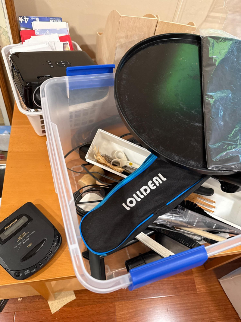 equipment, cables, and a collapsible reflector marked “Lollideal.” On the