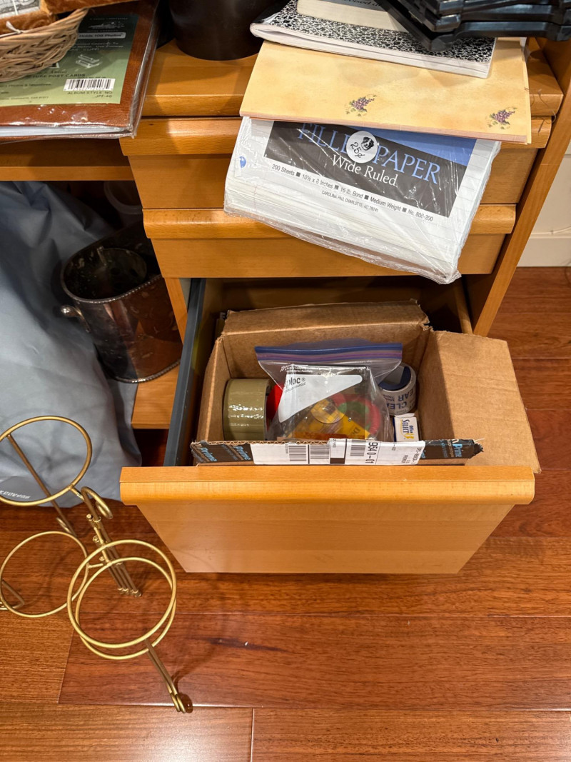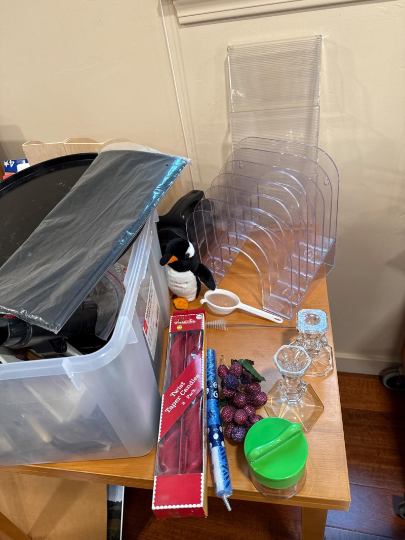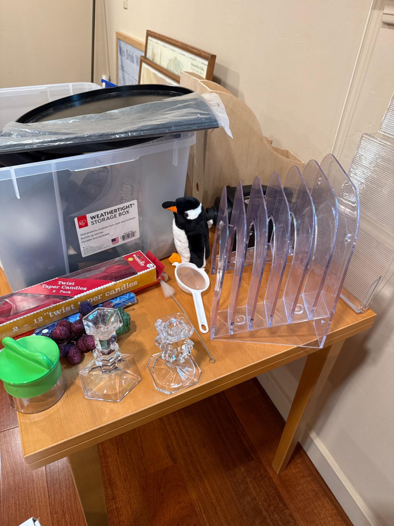 a white strainer, a green-lidded container, and clear acrylic file organizers.