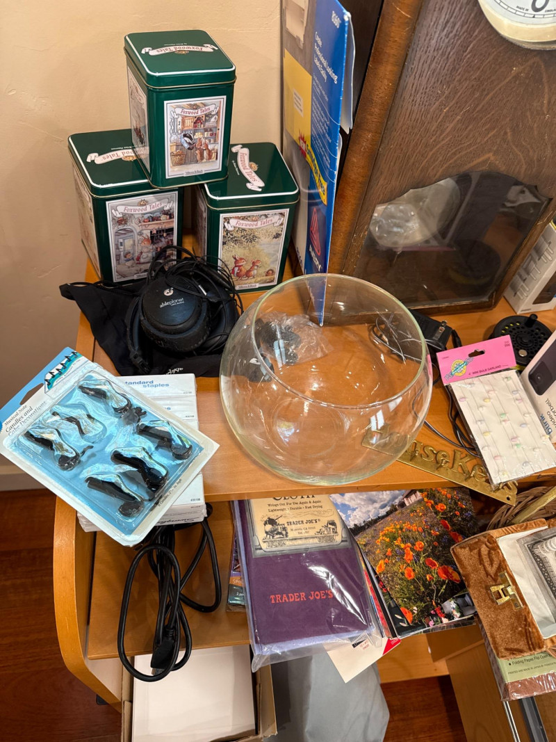 items include a glass bowl, four decorative green tins with illustrated scenes,