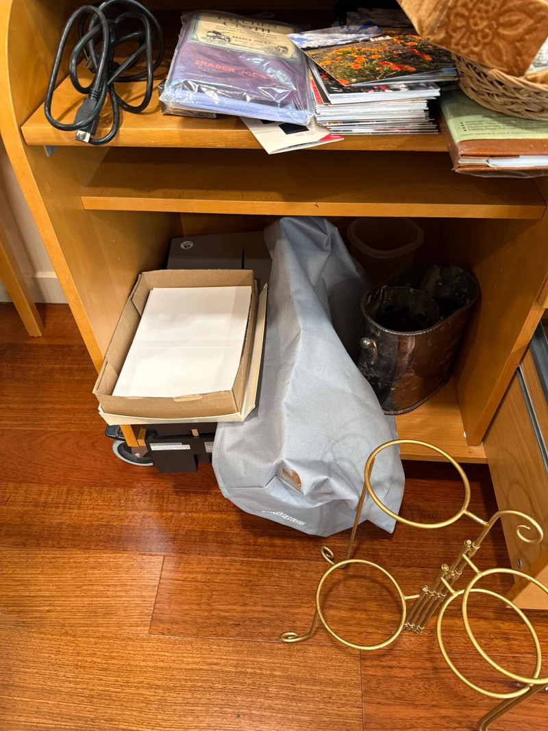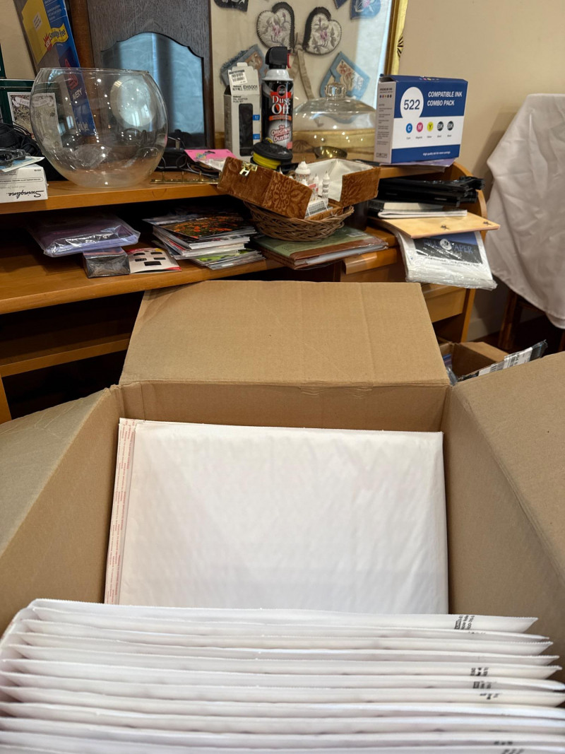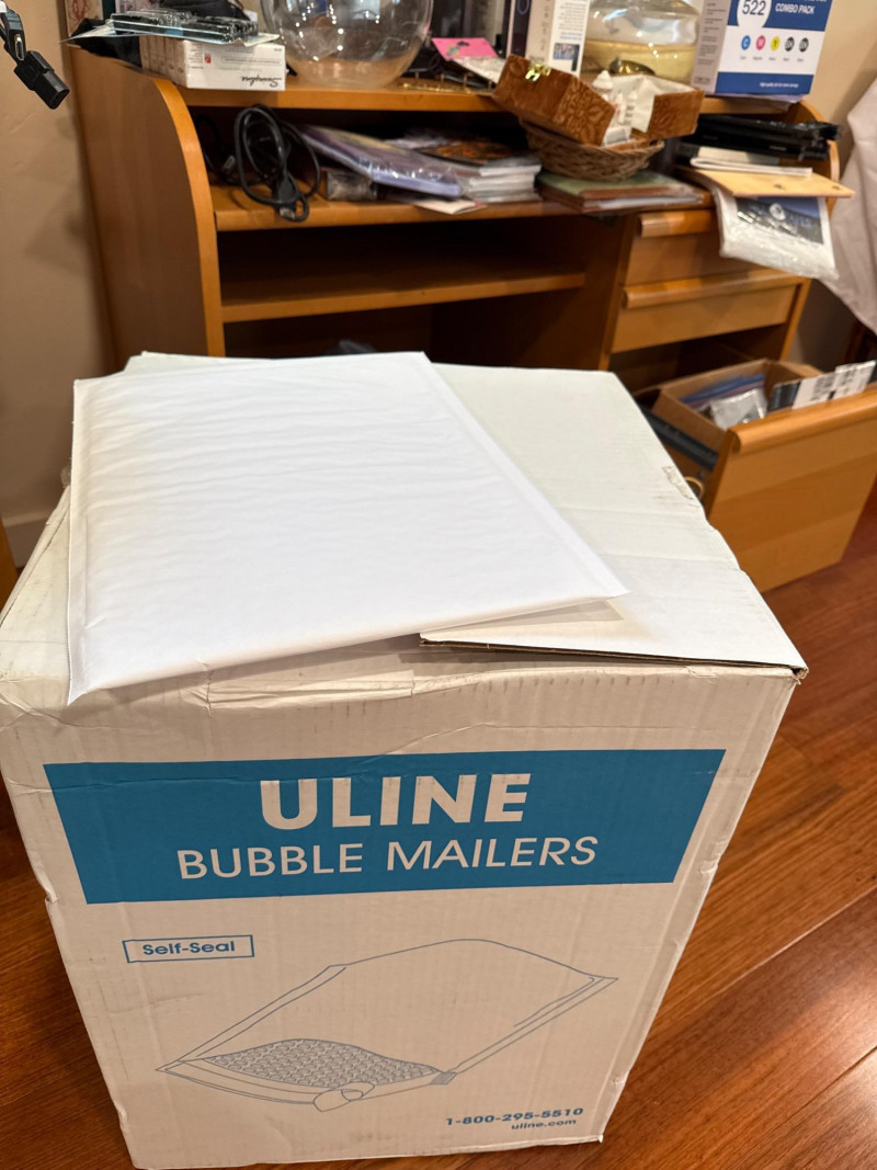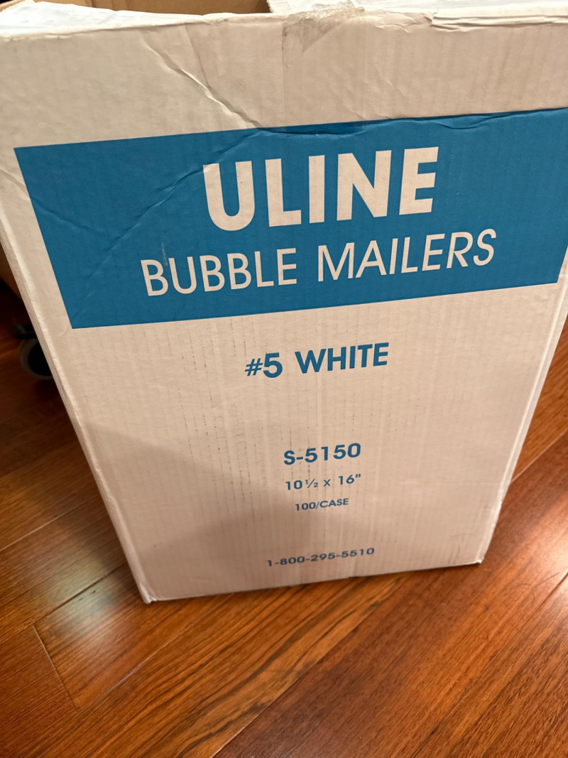 a brass-toned stand, and a boxed set of ULINE bubble mailers (#5 White, S-5150,