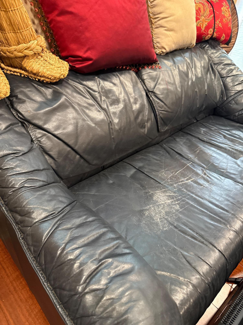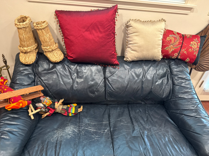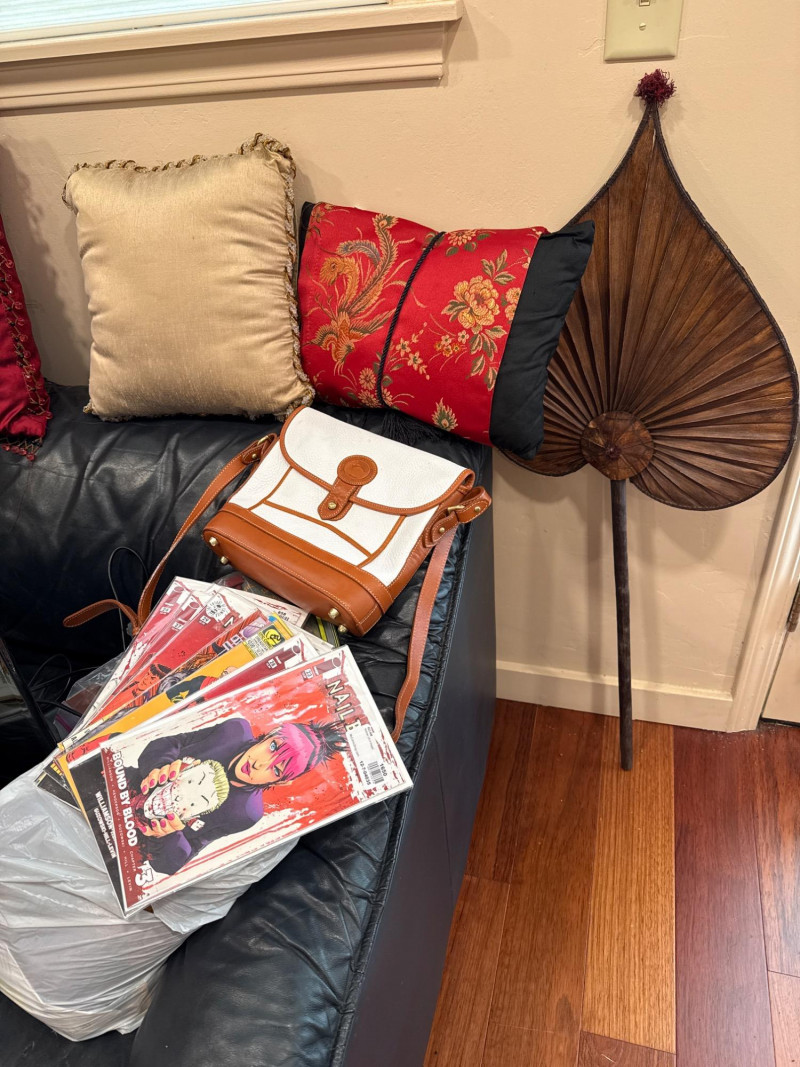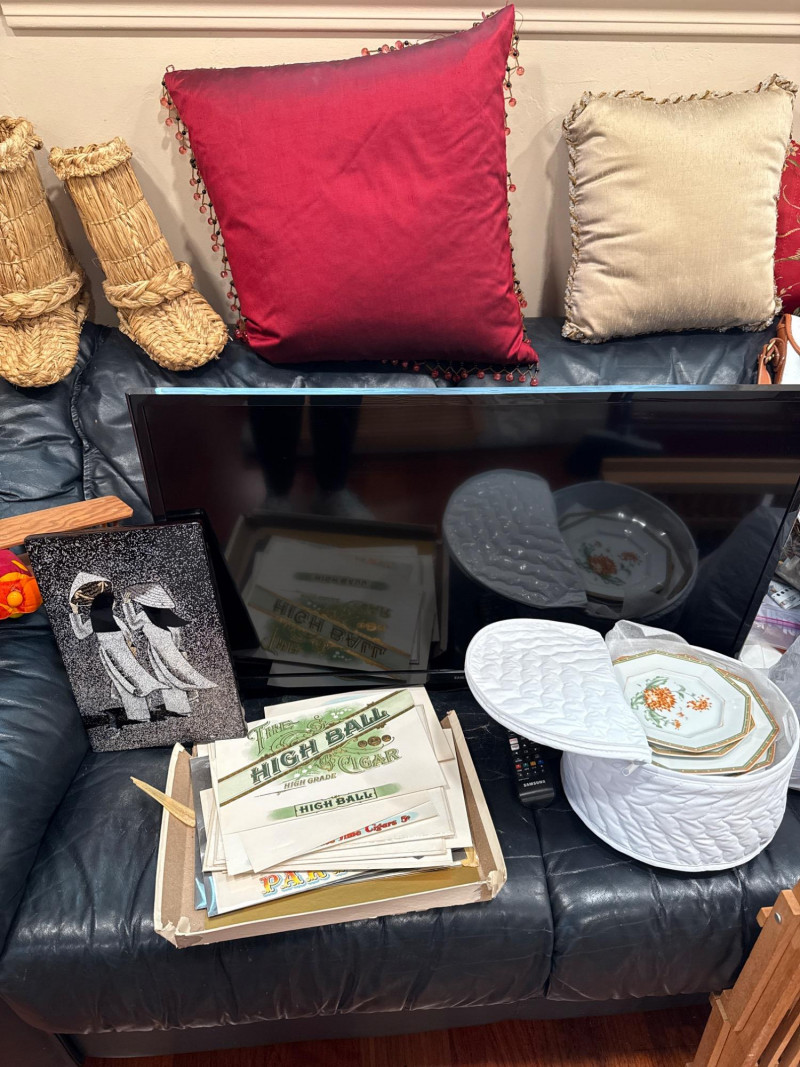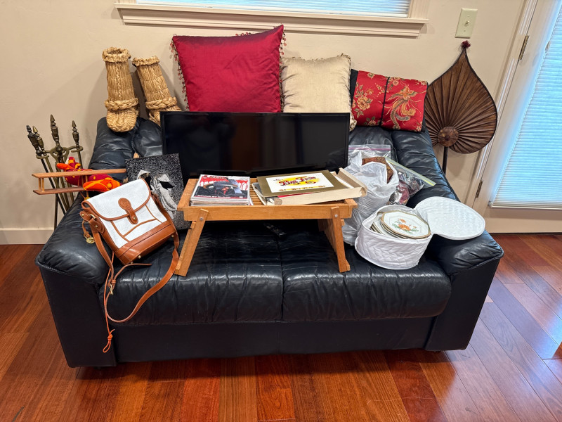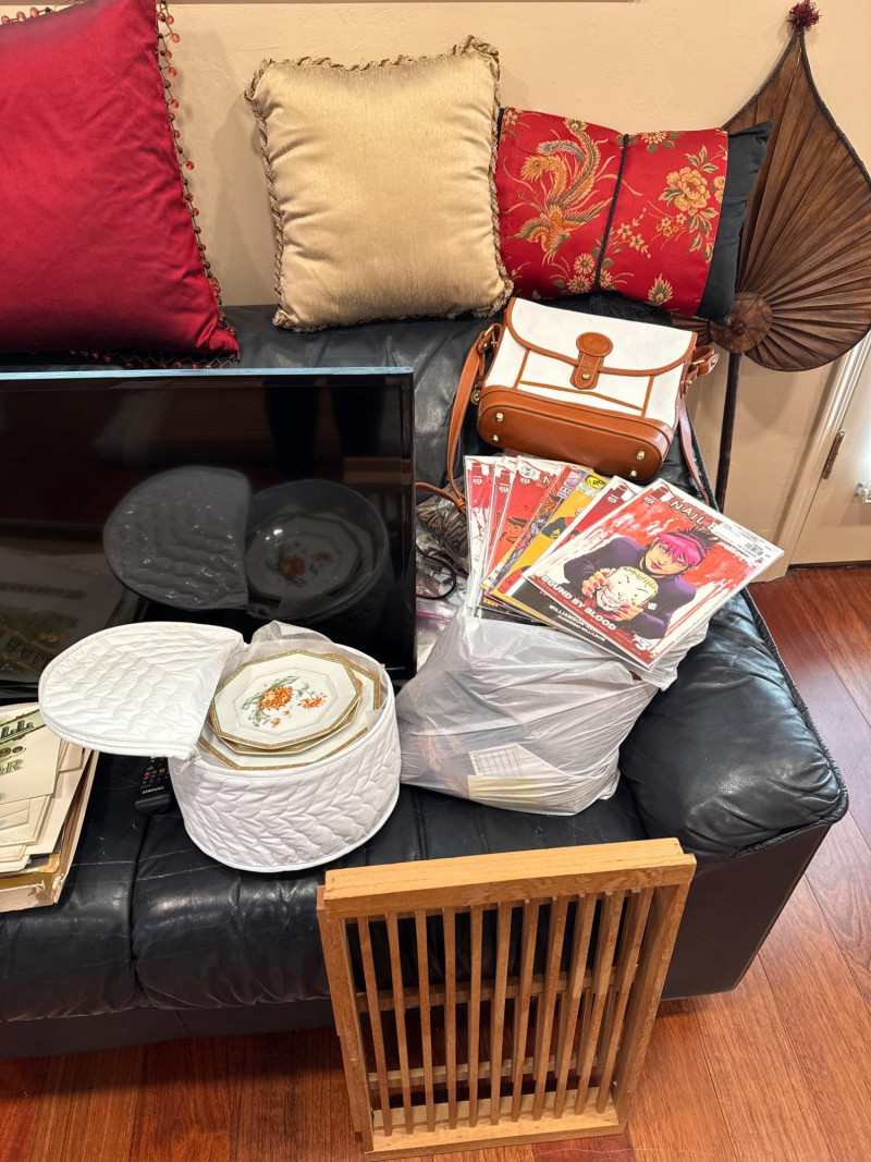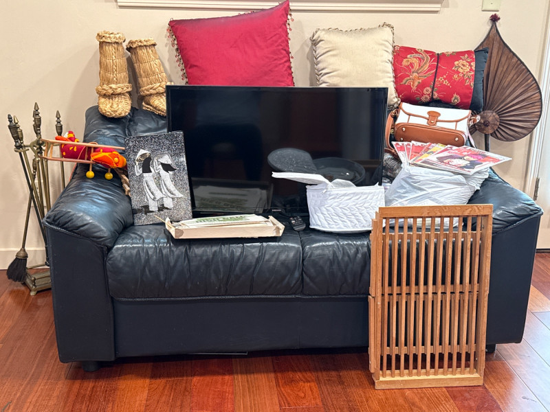 Samsung TV, Loveseat,Fitz Floyd Plates, Dooney Bag, Comics And Labels This extensive lot includes a black leather loveseat with visible cracks across the surface, accompanied by multiple decorative pillows in red, gold,