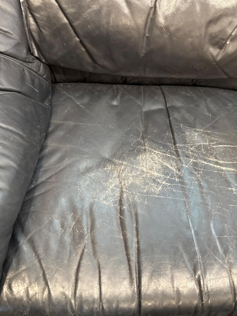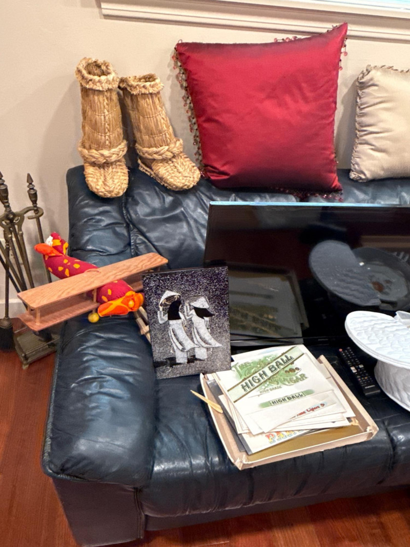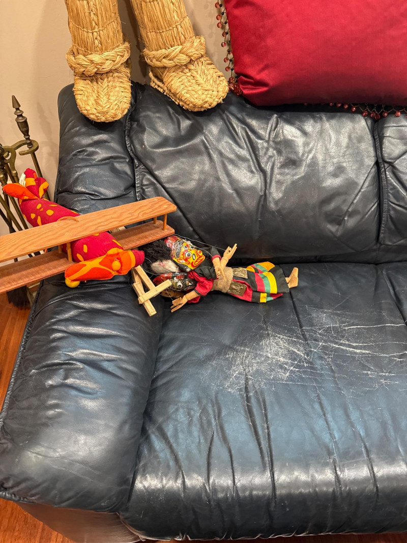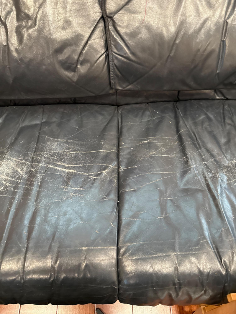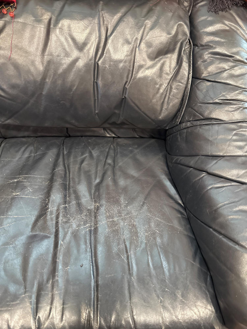 Samsung TV, Loveseat,Fitz Floyd Plates, Dooney Bag, Comics And Labels This extensive lot includes a black leather loveseat with visible cracks across the surface, accompanied by multiple decorative pillows in red, gold,