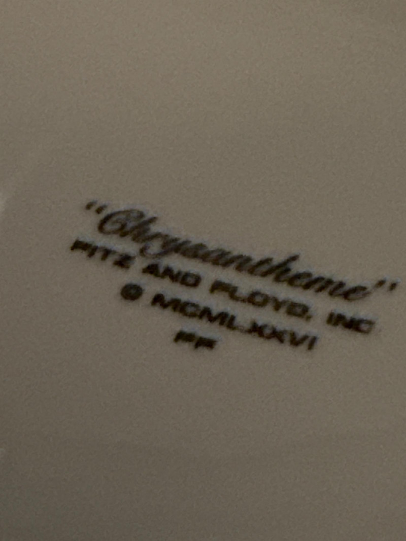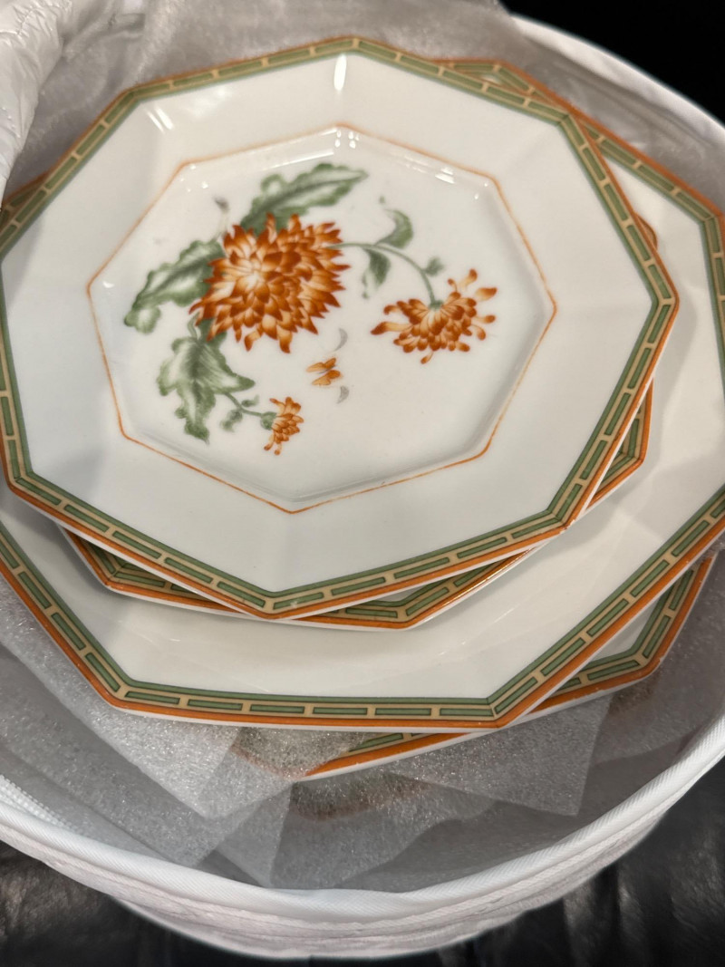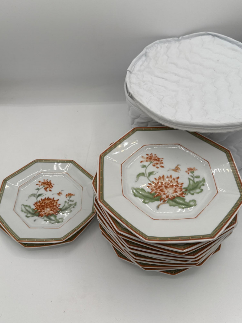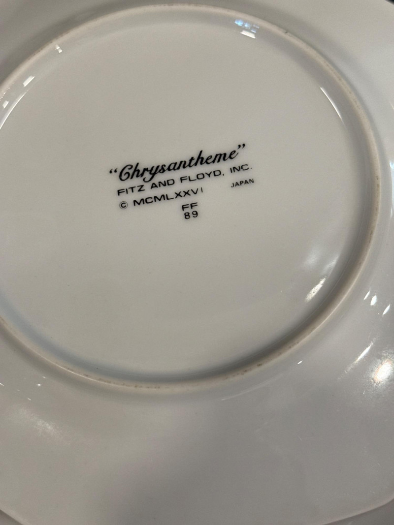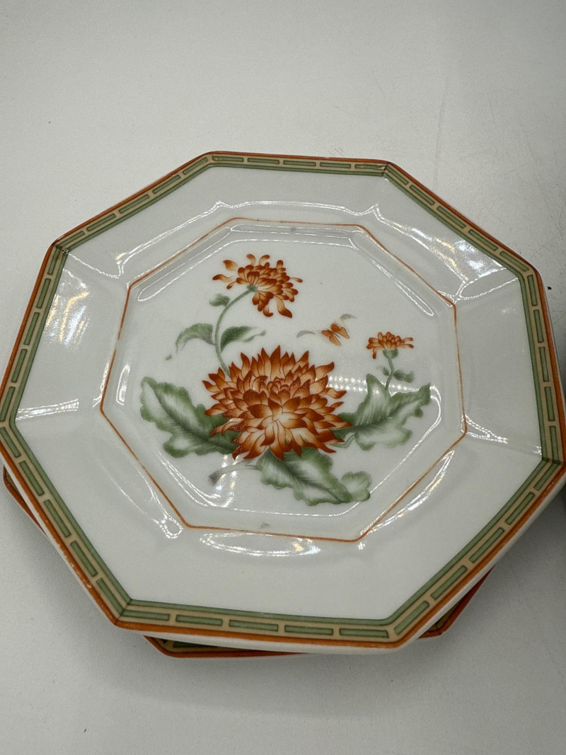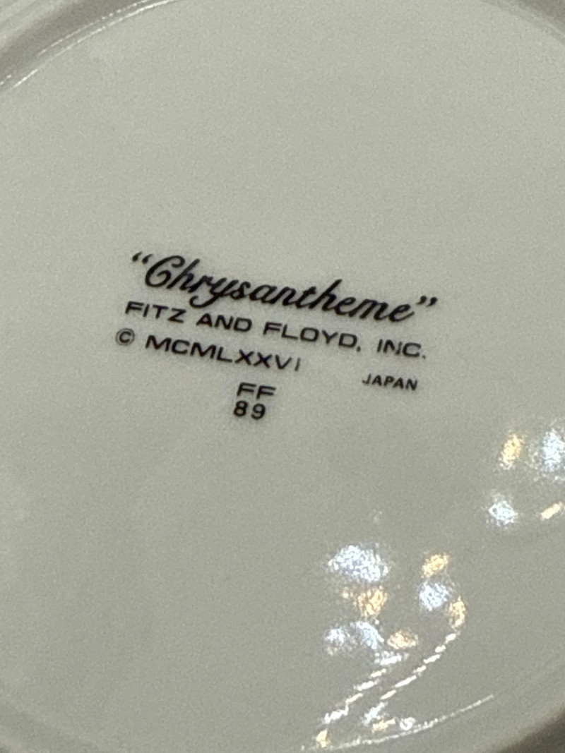 octagonal porcelain plates marked “Chrysanthemum” by Fitz and Floyd, Inc.,