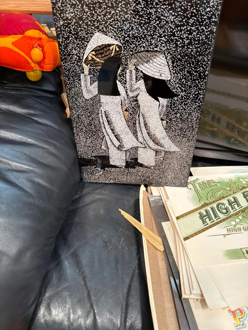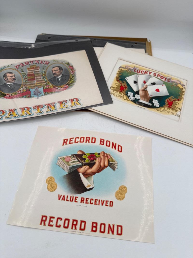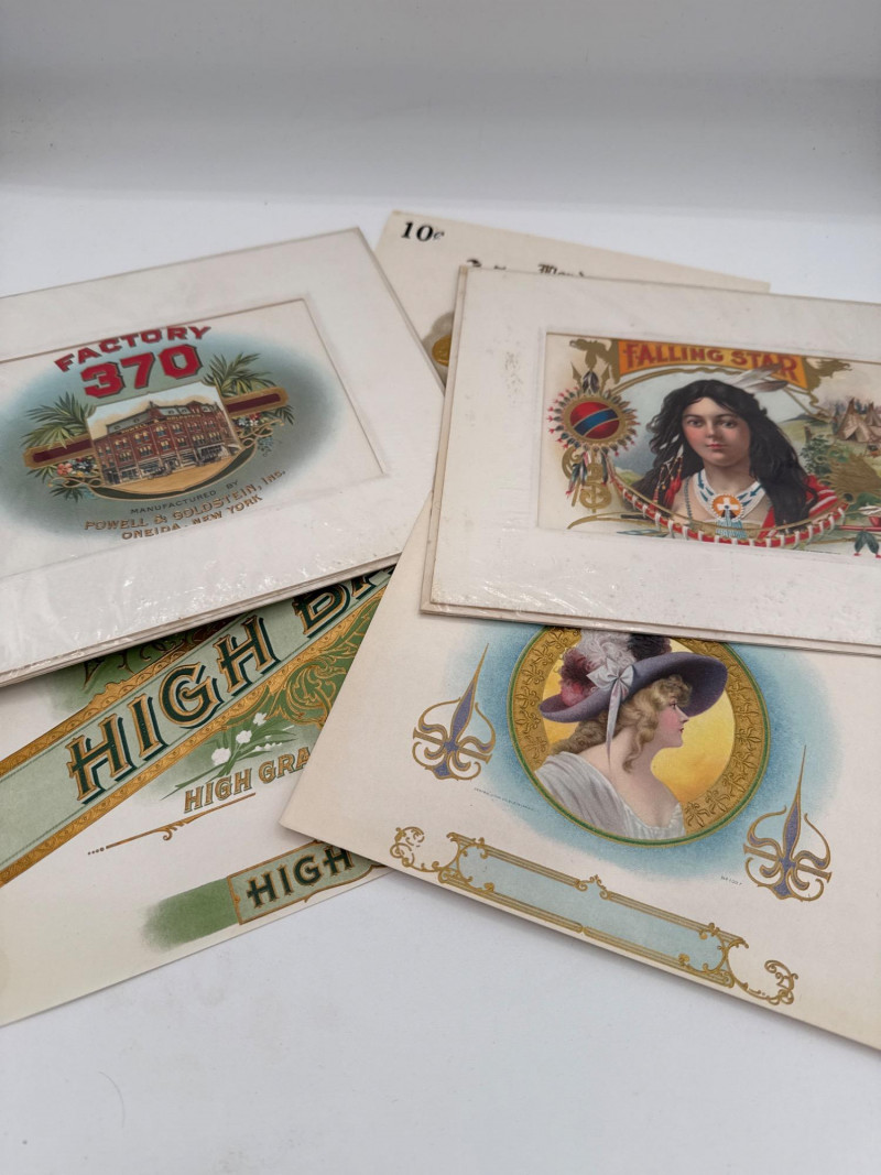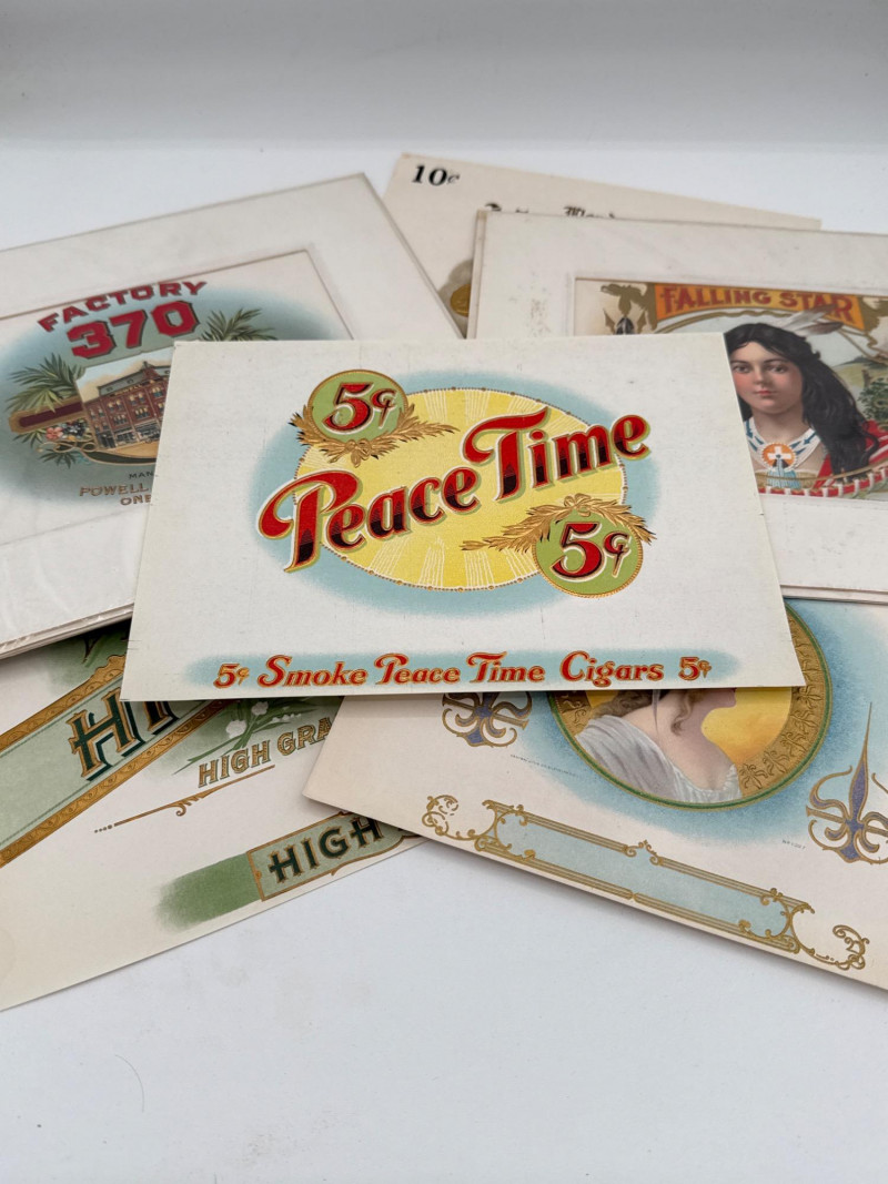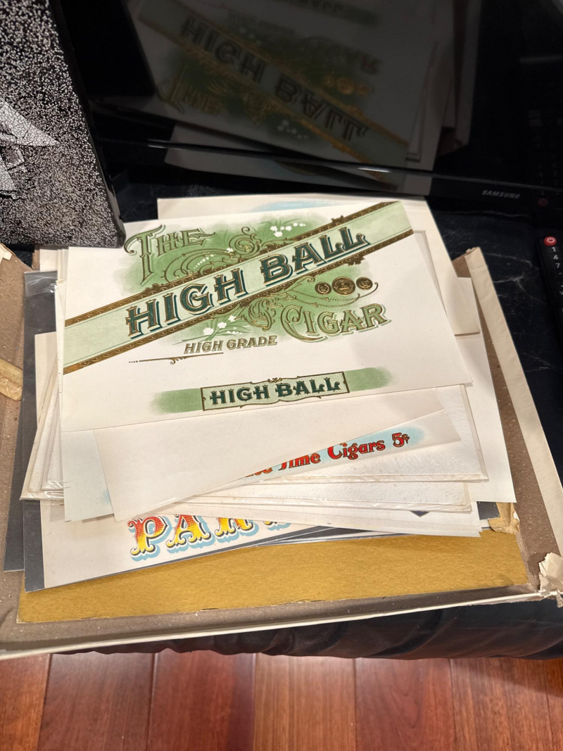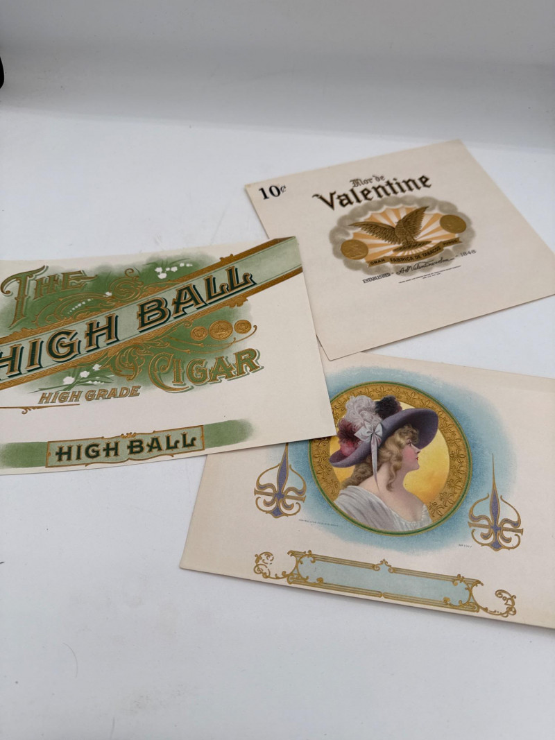 slatted rack, a wooden lap tray, and a collection of vintage cigar box labels