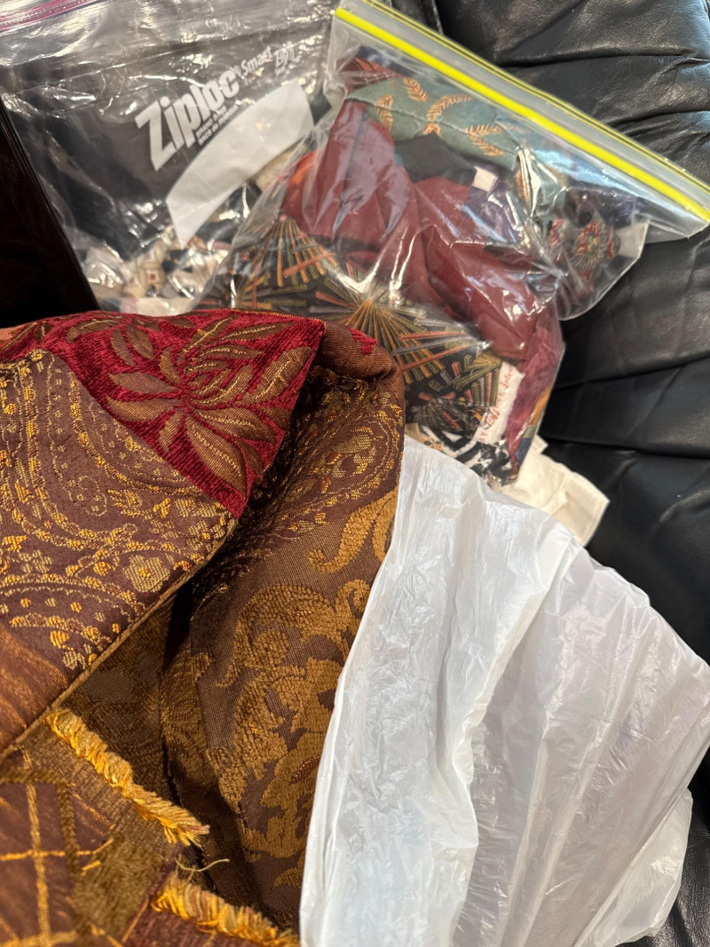 contains assorted fabric scraps in varied patterns and colors, suitable for