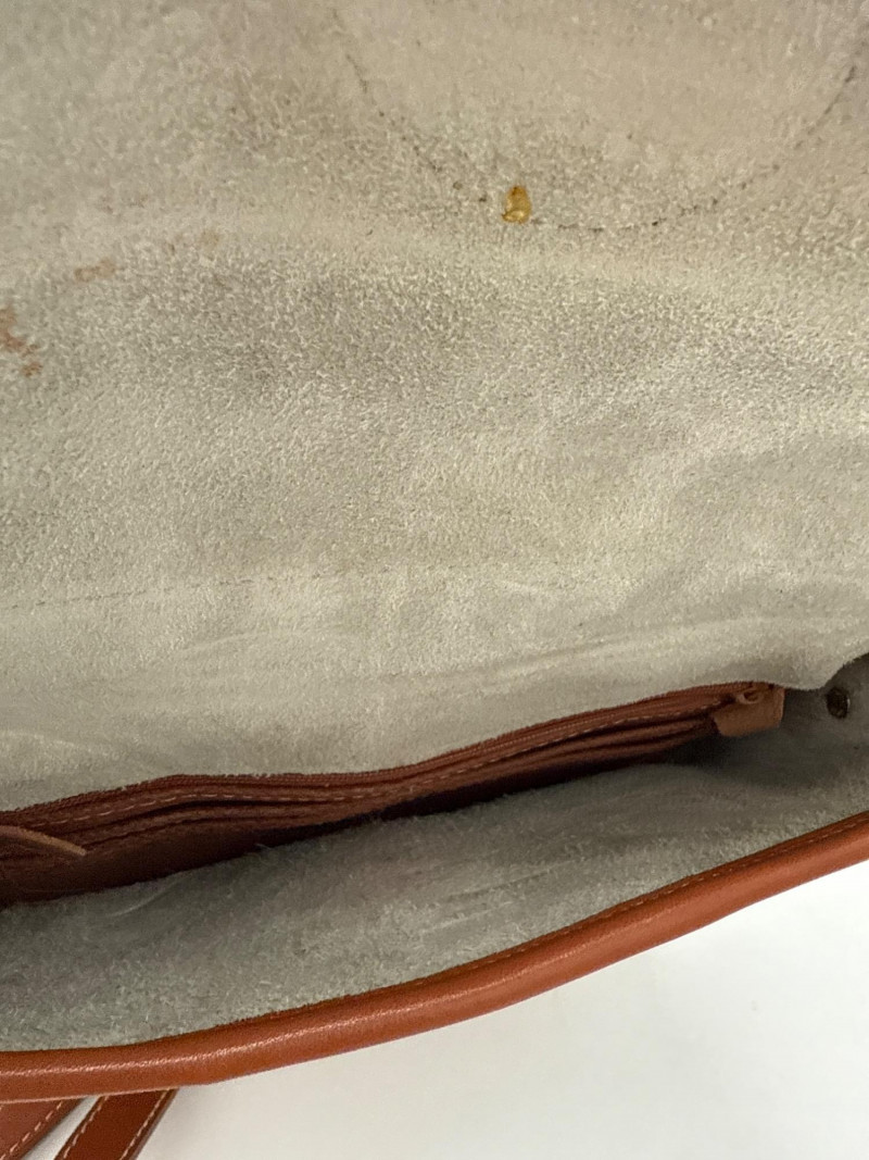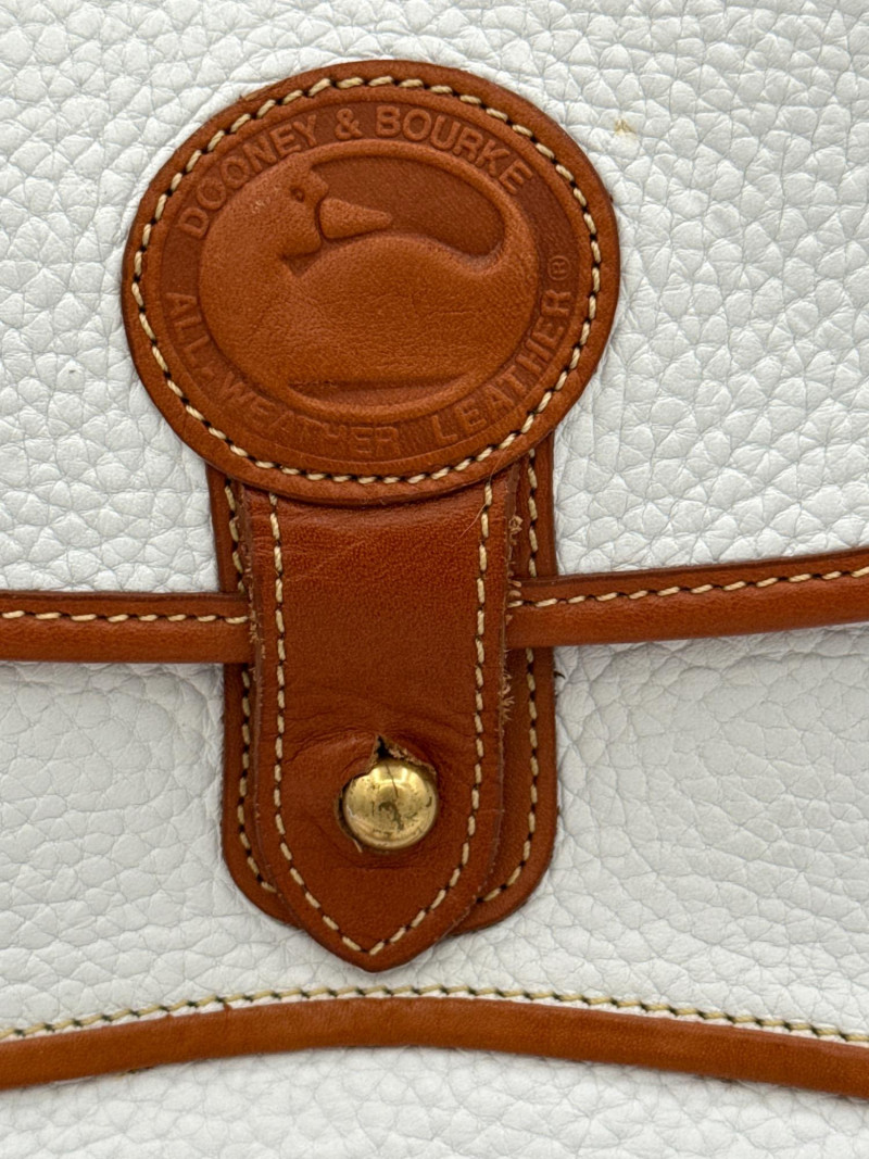 white pebbled leather with tan trim, brass hardware, and embossed branding on