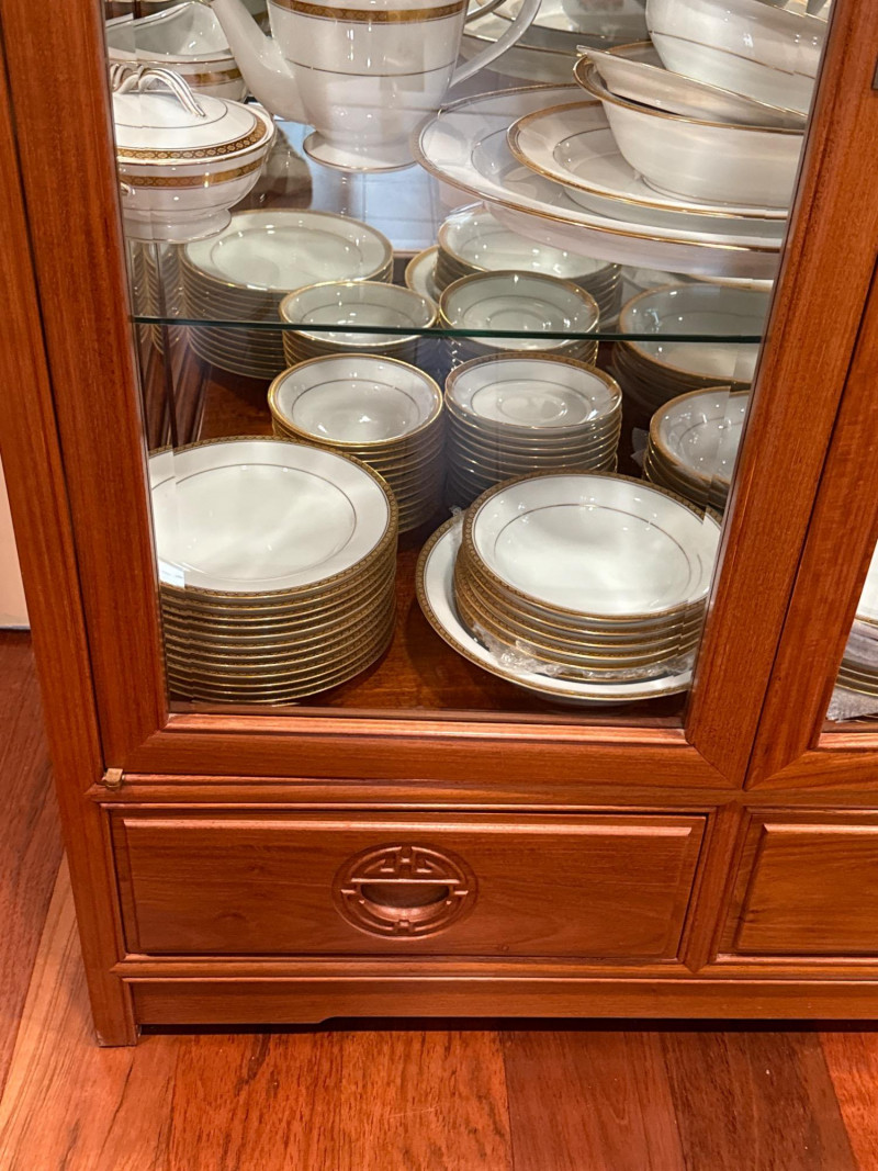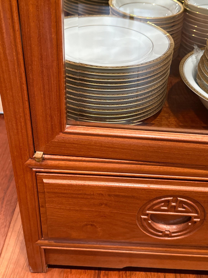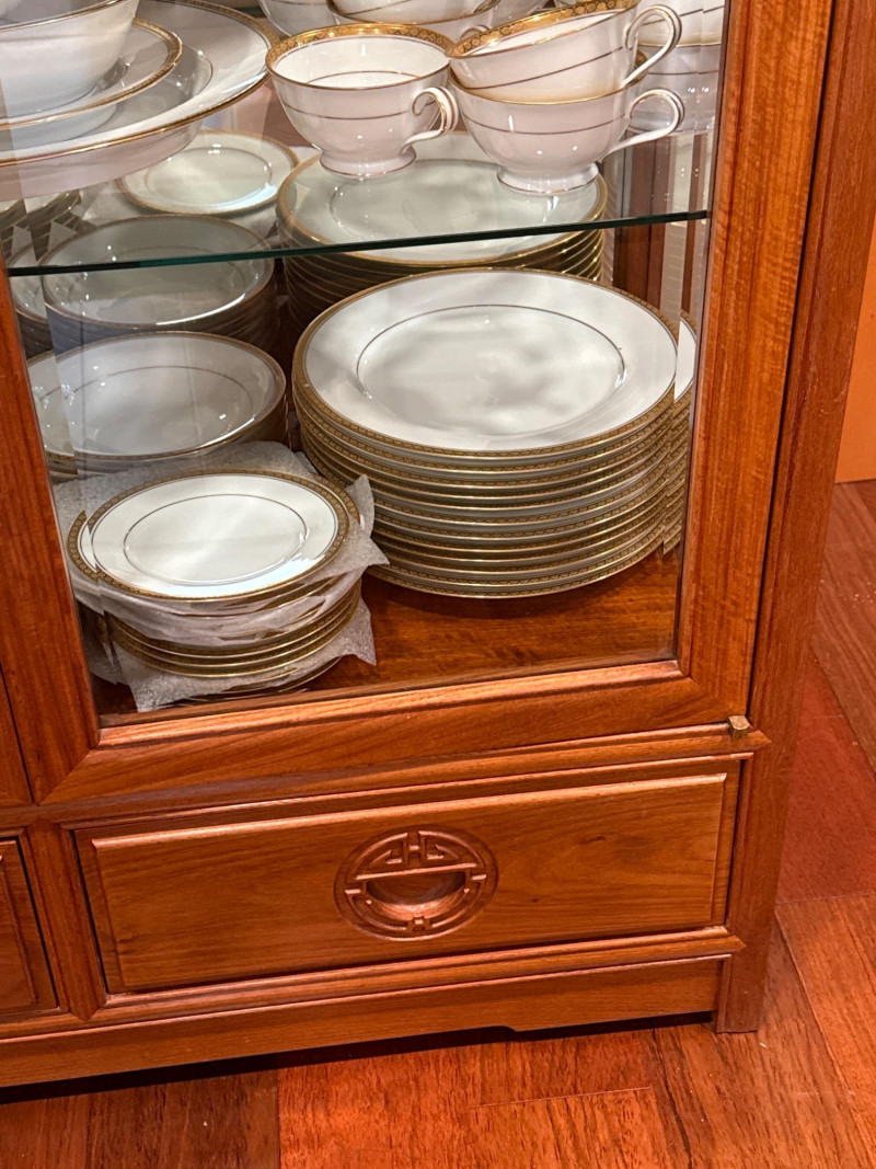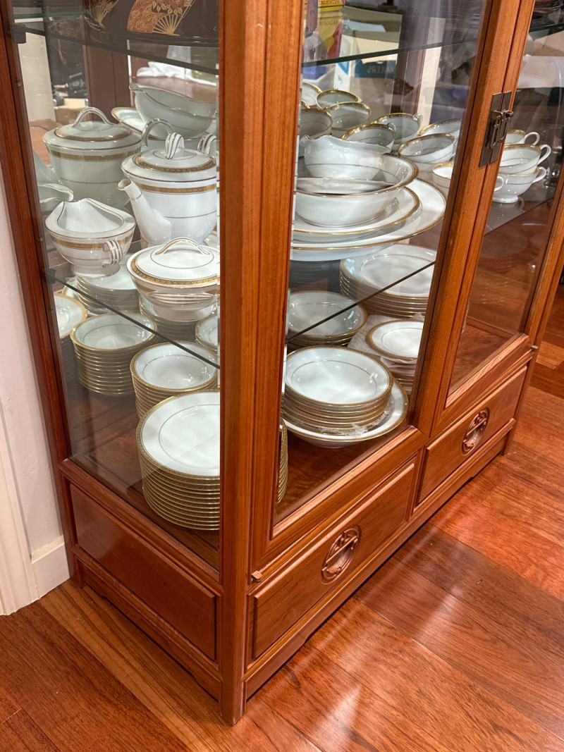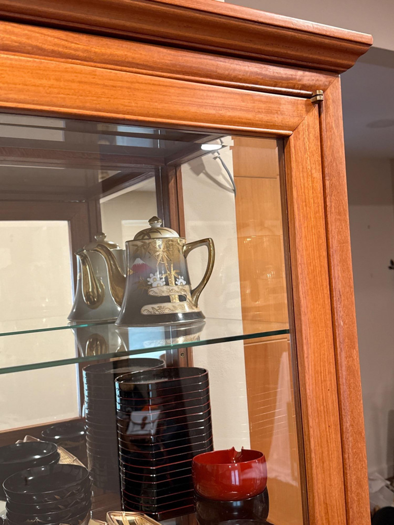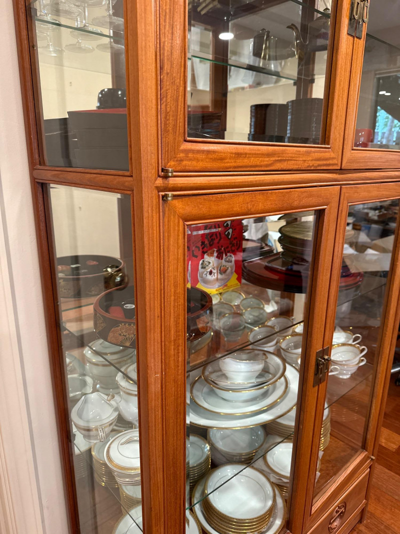 in a wooden glass-front China cabinet, accompanied by a matching rectangular