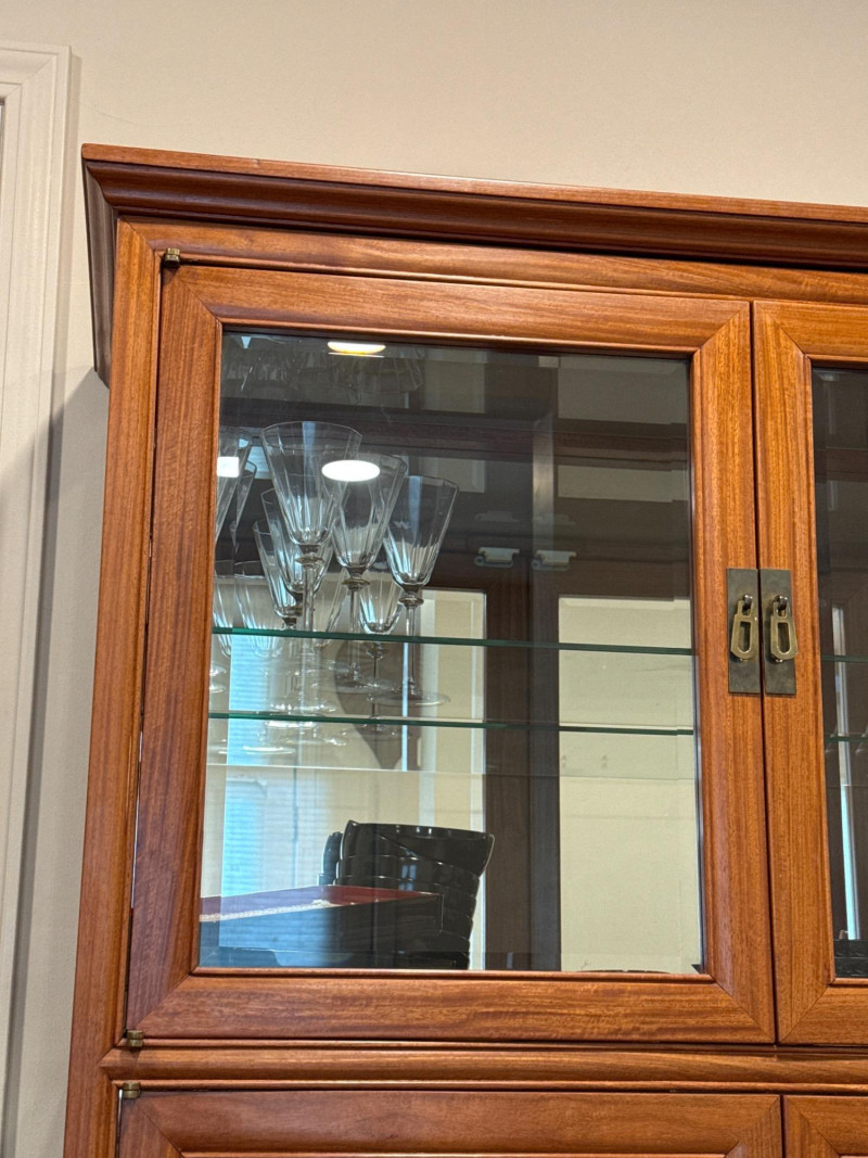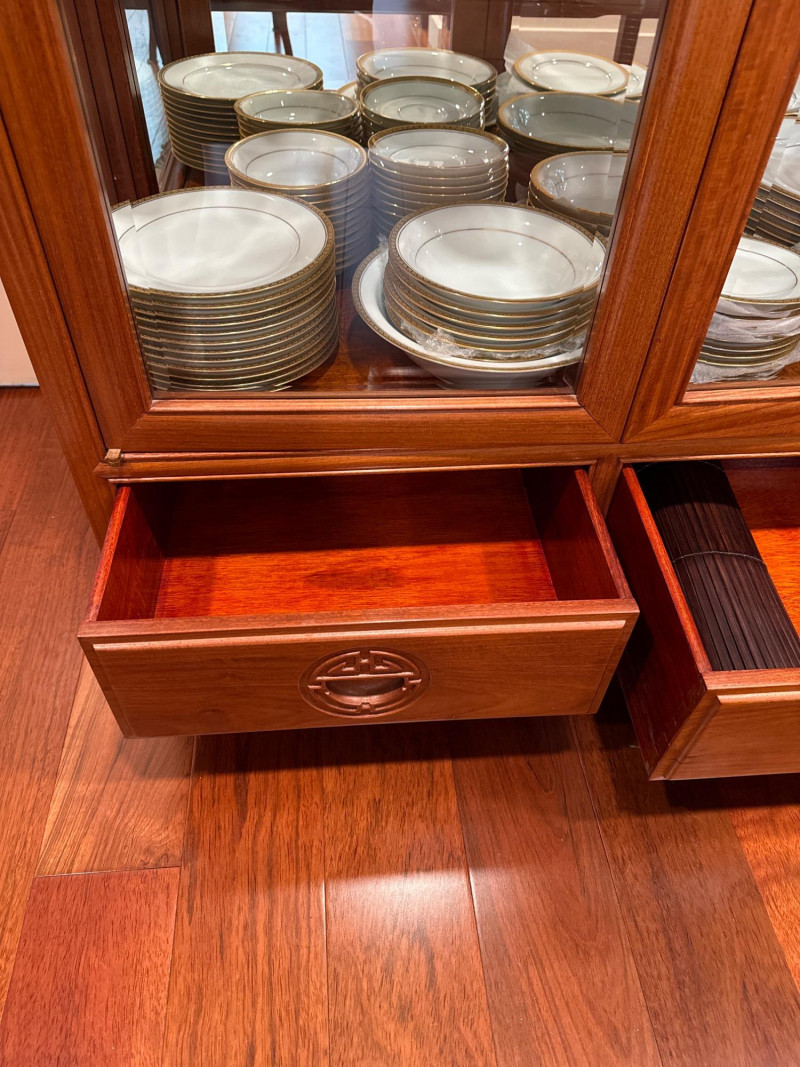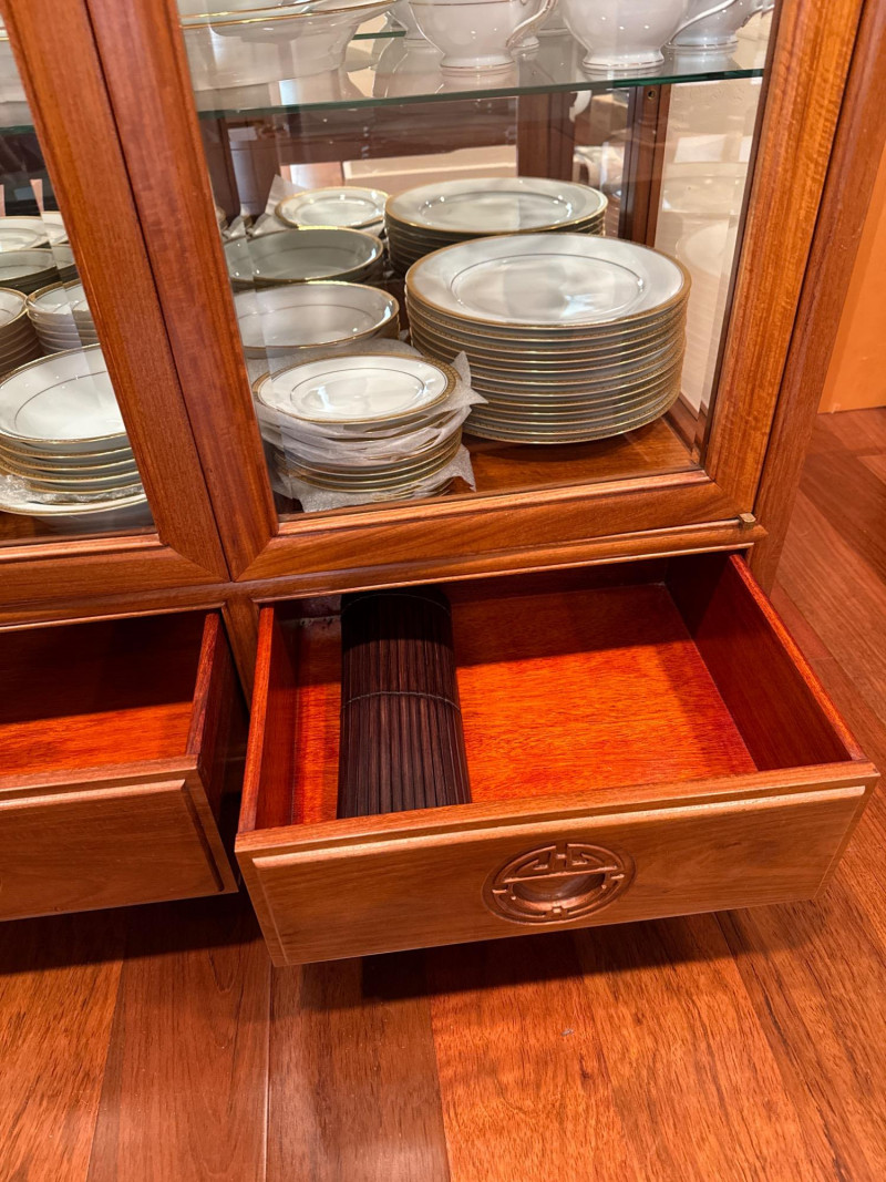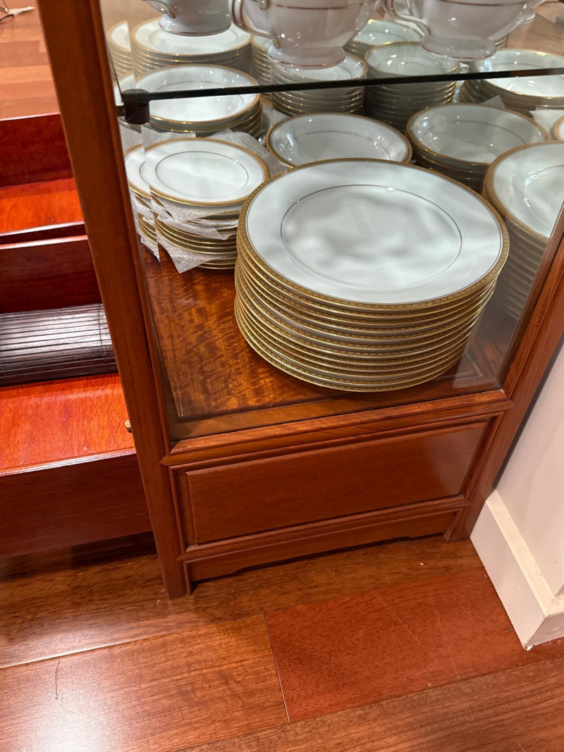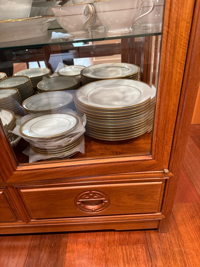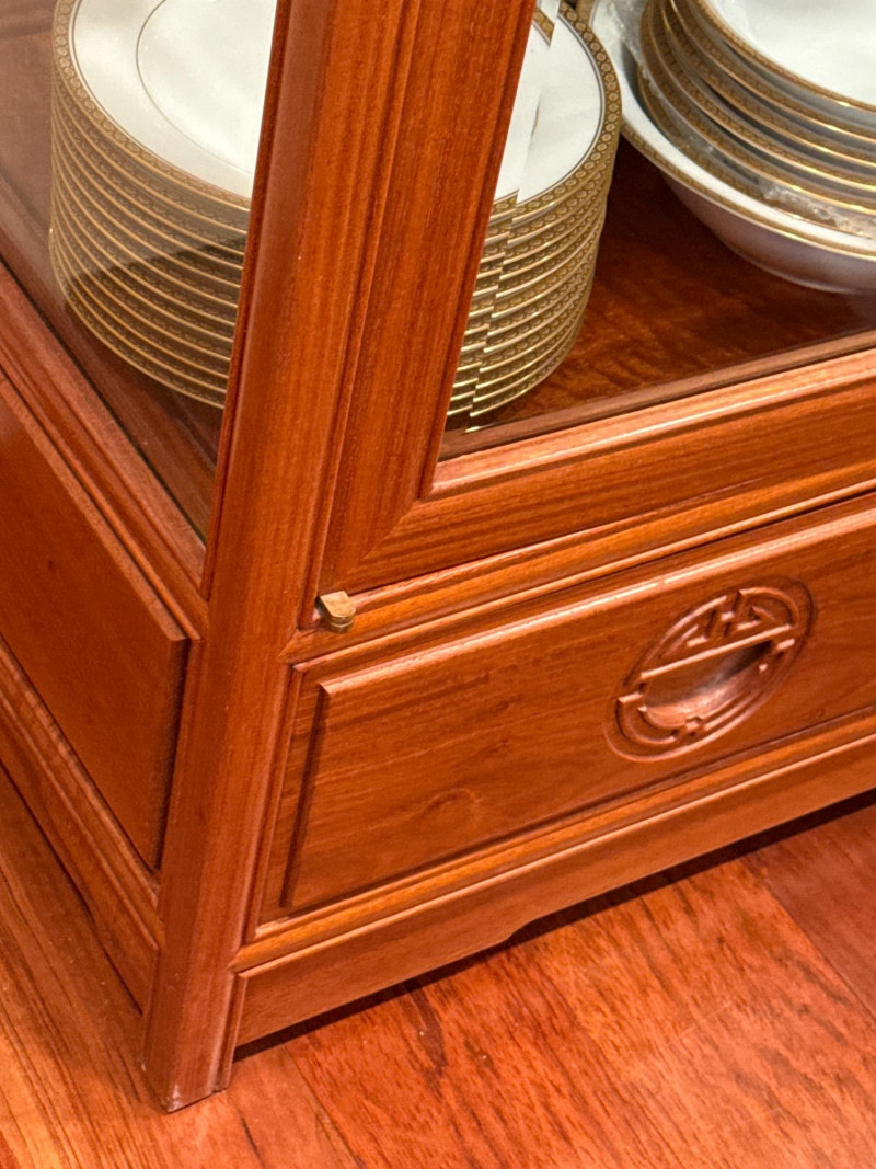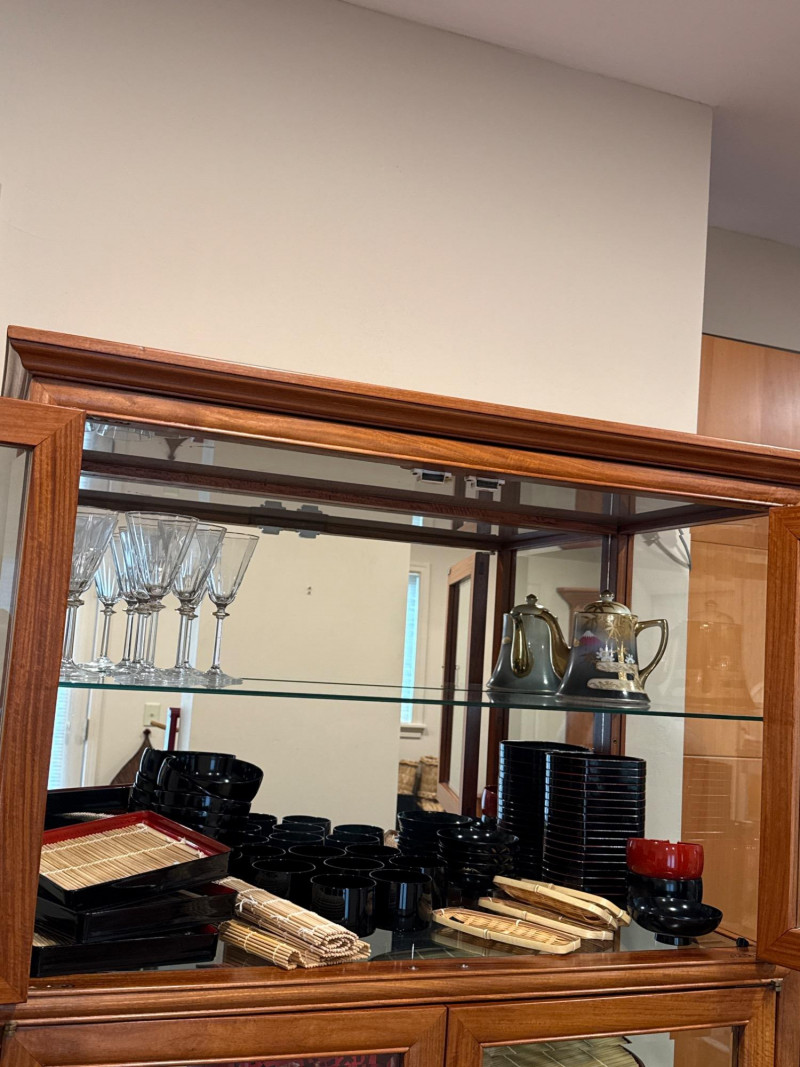 in a wooden glass-front China cabinet, accompanied by a matching rectangular
