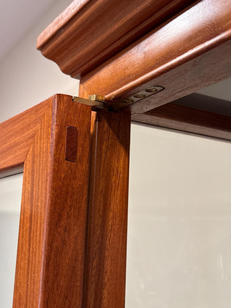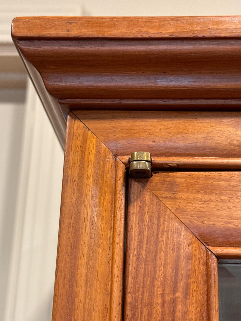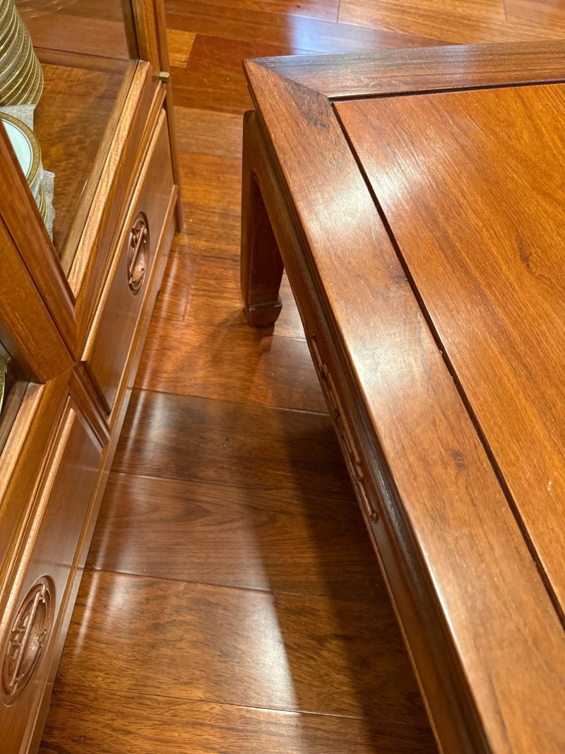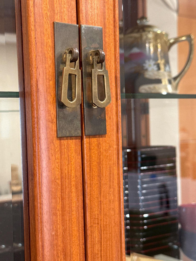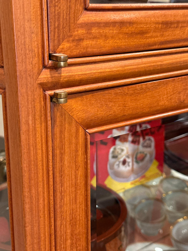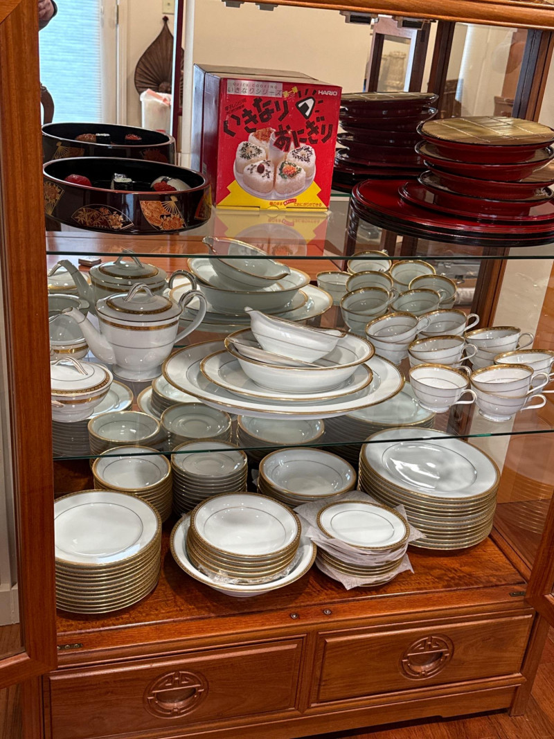 in a wooden glass-front China cabinet, accompanied by a matching rectangular