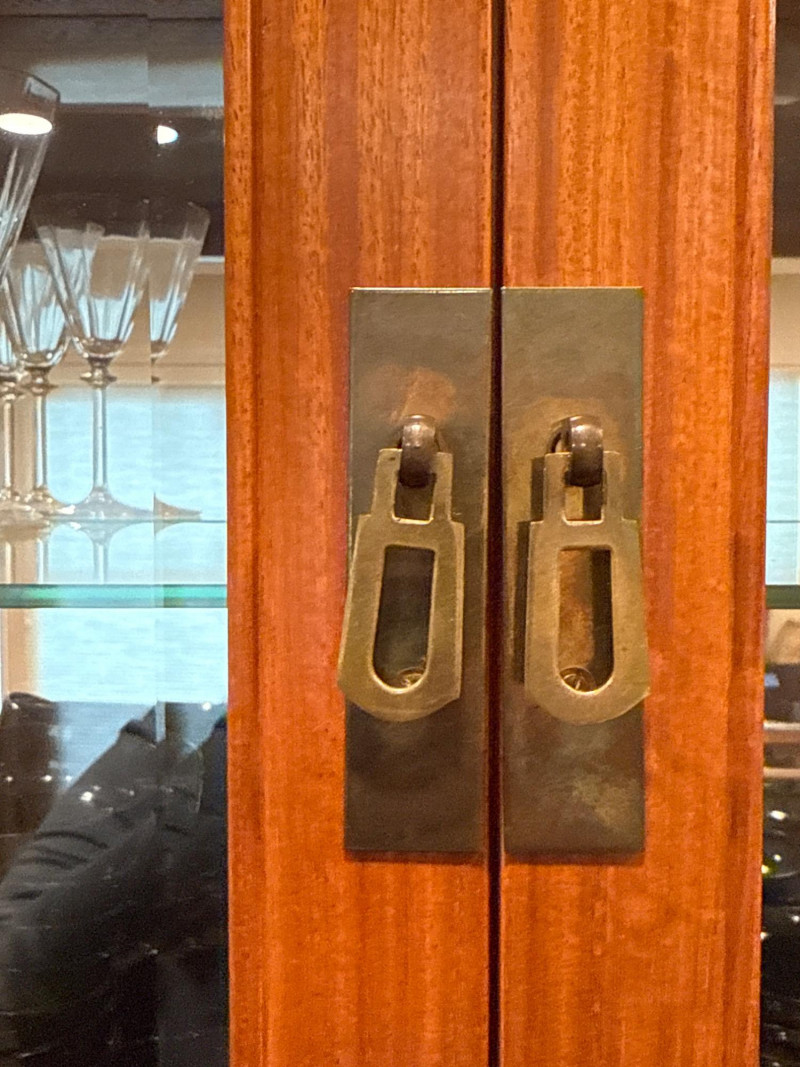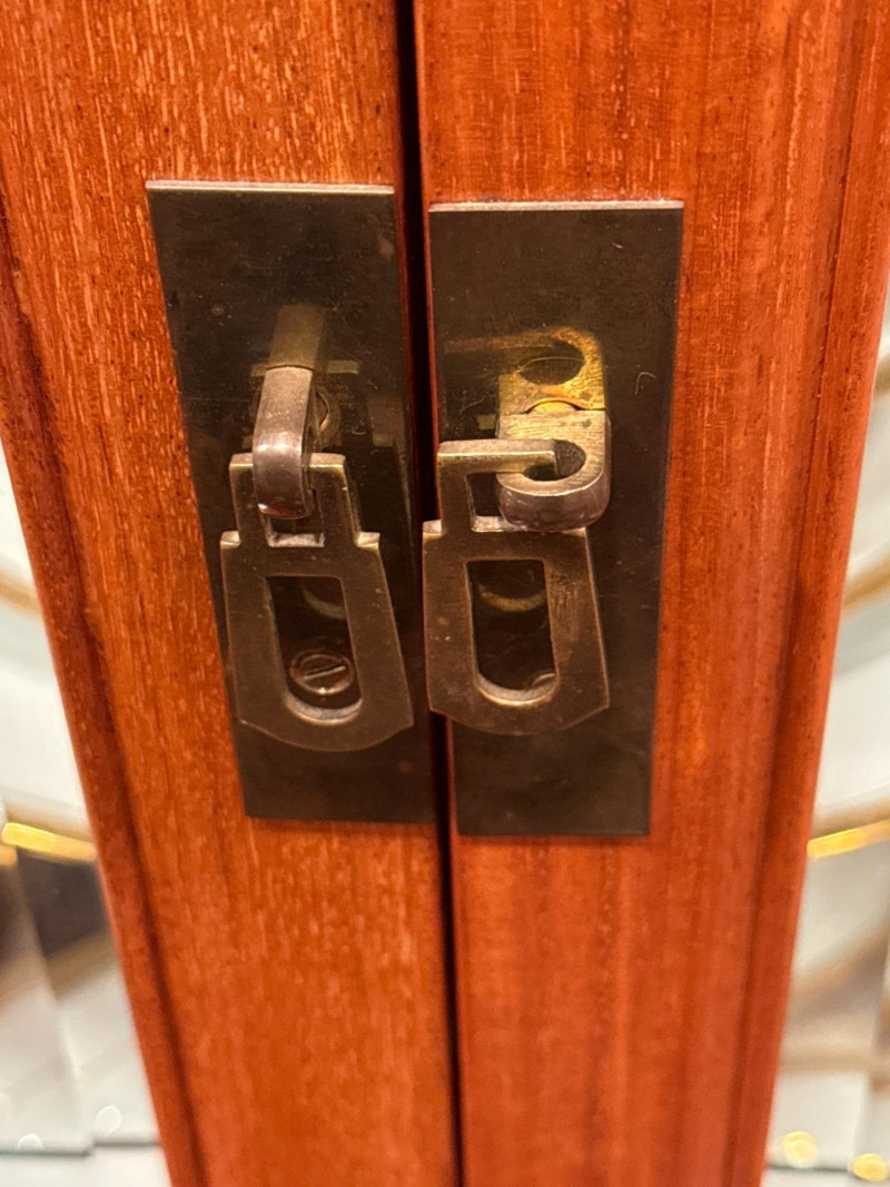 features four glass-paneled doors with brass hardware and two lower drawers,