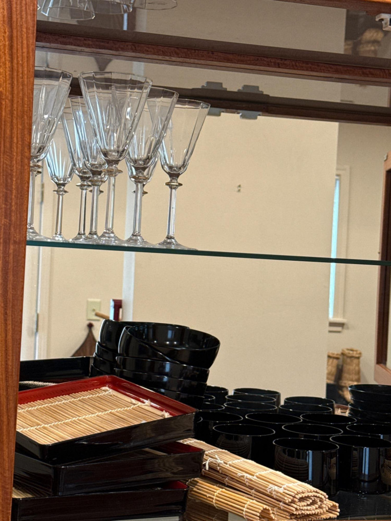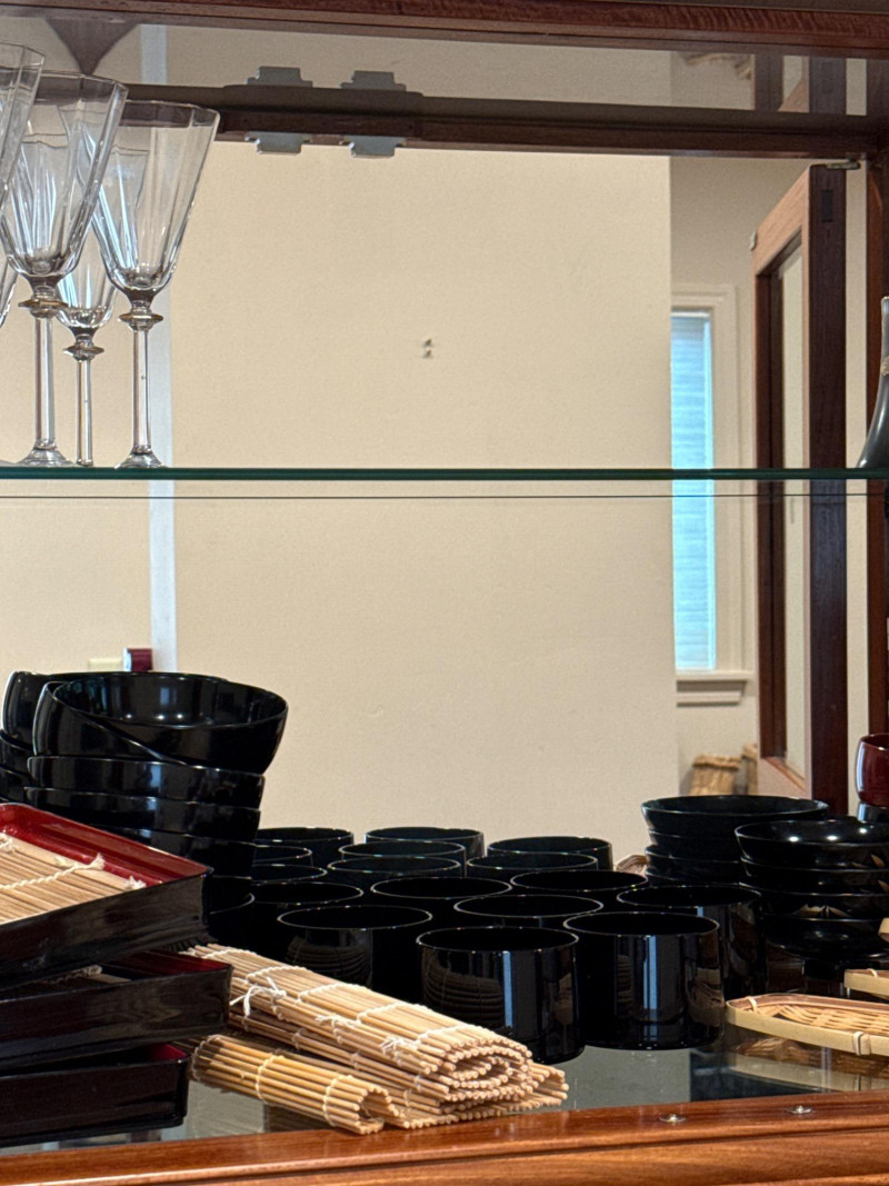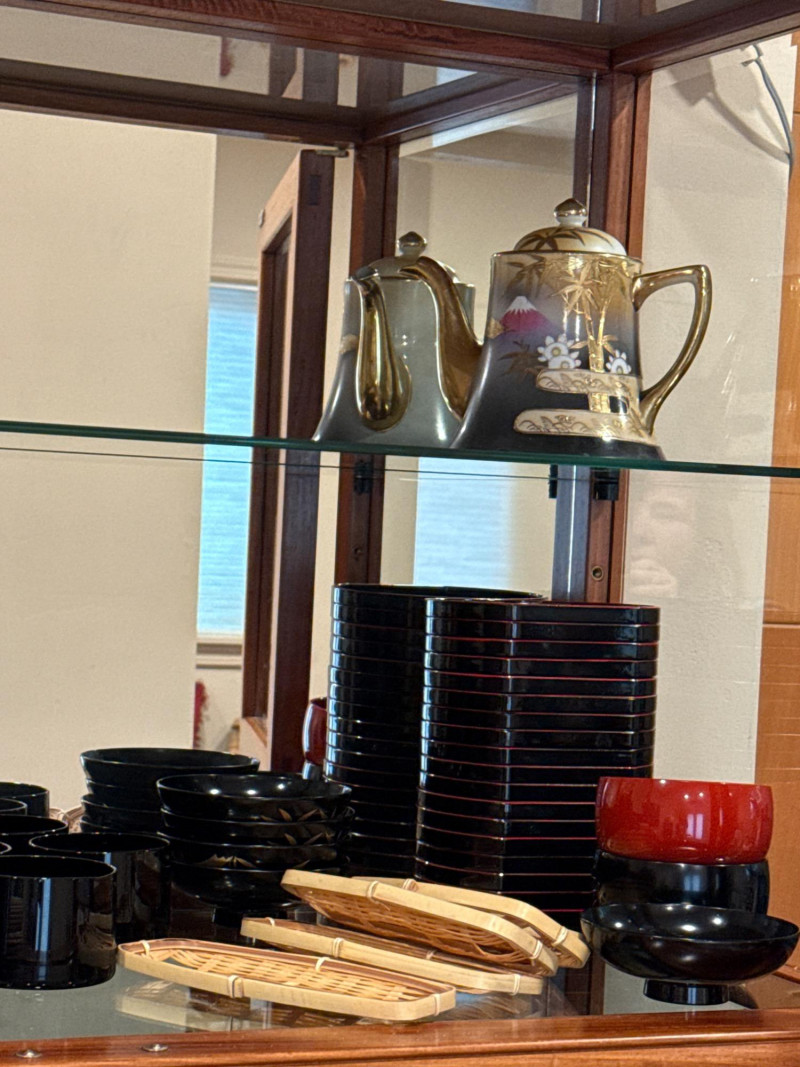 finishes, bamboo sushi mats, and a pair of decorative teapots with hand-painted