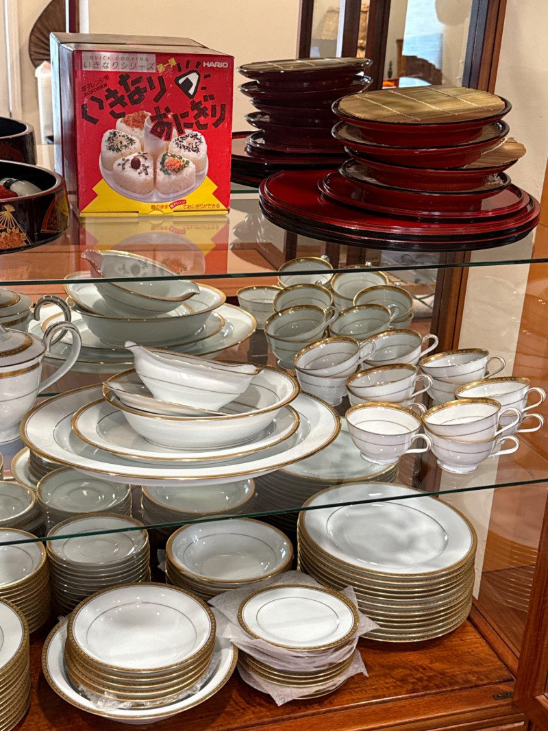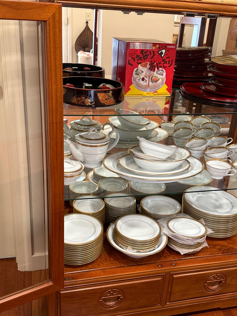 shelves containing a large assortment of fine porcelain dinnerware with white